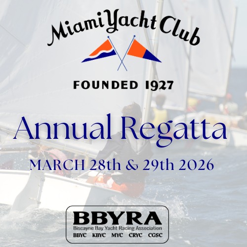 The MYC Annual Regatta is scheduled to coincide with BBYRA racing events, but boats are allowed to race in this regatta even if not registered in BBYRA by submitting an entry form with the MYC through Clubspot. It is a great opportunity for experienced racers, as well as those new to racing, to sail in large fleets on Biscayne Bay.
